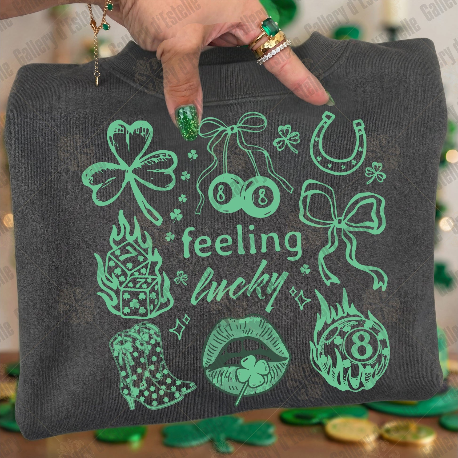 🍀Featuring shamrocks, dice, lucky 8 balls, bows, boots, and fiery vintage details, this design blends retro charm with trendy western energy for a look that feels festive, stylish, and just a little rebellious. It’s lucky girl energy with a bold twist 💚Created as a high-resolution PNG (300 DPI) and sized at 15×15 inches, this design comes in 3 color variations, and comes ready for easy use on shirts, sweatshirts, totes, POD products, posters, and seasonal crafts.🍀Whether you’re creating for your shop or adding a standout piece to your St. Patrick’s Day collection, this design is made for those who love playful symbols, western flair, and designs that don’t play it safe 🍀✨ However you craft it, may it bring extra luck and good vibes your way.🍀😄